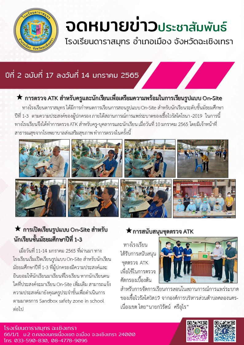 เปิดเรียน On-Site ระดับมัธยมศึกษาปีที่ 1-3 และการตรวจ ATK สำหรับครูและนักเรียน เพื่อเตรียมความพร้อมในการเปิดเรียน On-Site