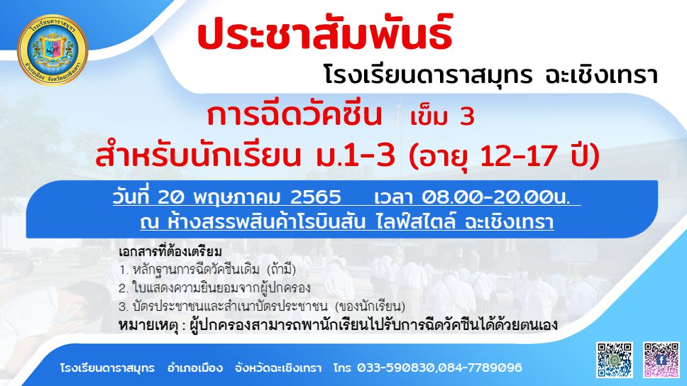หน้าแรก ข่าวประชาสัมพันธ์ แจ้งการฉีดวัคซีนโควิด-19 เข็ม 3 สำหรับนักเรียน ข่าวประชาสัมพันธ์ แจ้งการฉีดวัคซีนโควิด-19 เข็ม 3 สำหรับนักเรียน โดย โรงเรียนดาราสมุทร ฉะเชิงเทรา - 19 พฤษภาคม 2565 1133 0 บทความที่เกี่ยวข้องเพิ่มเติมจากผู้เขียน การประชุมผู้บริหารโรงเรียนเอกชน จังหวัดฉะเชิงเทรา ตารางสอบกลางภาคเรียนที่ 1/2567 การตรวจติดตามเงินอุดหนุนฯ 2567 ข่าวประชาสัมพันธ์ [ล่าสุด] การประชุมผู้บริหารโรงเรียนเอกชน จังหวัดฉะเชิงเทรา 18 ธันวาคม 2567 ตารางสอบกลางภาคเรียนที่ 1/2567 9 กรกฎาคม 2567 ข่าวกิจกรรม [ล่าสุด] ร่วมงานนมัสการหลวงพ่อโสธร 2567 19 พฤศจิกายน 2567 กิจกรรมวันเฉลิมพระชนมพรรษา สมเด็จพระพันปีหลวง และวันแม่แห่งชาติ 9 สิงหาคม 2567
