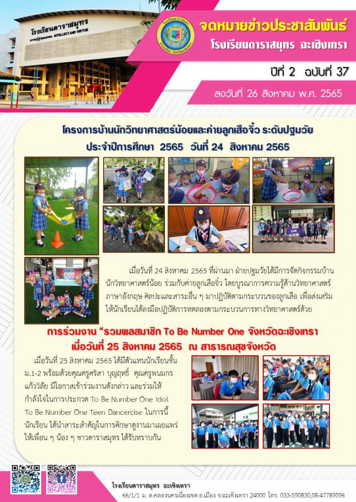 จดหมายข่าวประชาสัมพันธ์ ฉบับที่ 37 เรื่องโครงการบ้านนักวิทยาศาสตร์น้อยและค่ายลูกเสือจิ๋ว และนักเรียนมีโอกาสไปเข้าร่วมงานรวมพล To Be Number One จังหวัดฉะเชิงเทรา