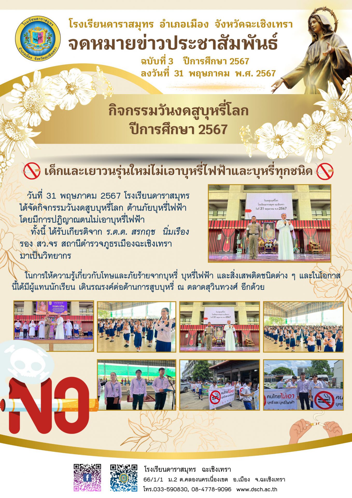 หน้าแรก ข่าวกิจกรรม กิจกรรมวันงดสูบบุหรี่โลก ปีการศึกษา 2567 ข่าวกิจกรรม กิจกรรมวันงดสูบบุหรี่โลก ปีการศึกษา 2567 โดย โรงเรียนดาราสมุทร ฉะเชิงเทรา - 4 มิถุนายน 2567 1194 0 ดูภาพเพิ่มเติม บทความที่เกี่ยวข้องเพิ่มเติมจากผู้เขียน ร่วมงานนมัสการหลวงพ่อโสธร 2567 กิจกรรมวันเฉลิมพระชนมพรรษา สมเด็จพระพันปีหลวง และวันแม่แห่งชาติ กิจกรรมวันเฉลิมพระชนมพรรษา พระบาทสมเด็จพระวชิรเกล้า เจ้าอยู่หัว ข่าวประชาสัมพันธ์ [ล่าสุด] การประชุมผู้บริหารโรงเรียนเอกชน จังหวัดฉะเชิงเทรา 18 ธันวาคม 2567 ตารางสอบกลางภาคเรียนที่ 1/2567 9 กรกฎาคม 2567 ข่าวกิจกรรม [ล่าสุด] ร่วมงานนมัสการหลวงพ่อโสธร 2567 19 พฤศจิกายน 2567 กิจกรรมวันเฉลิมพระชนมพรรษา สมเด็จพระพันปีหลวง และวันแม่แห่งชาติ 9 สิงหาคม 2567